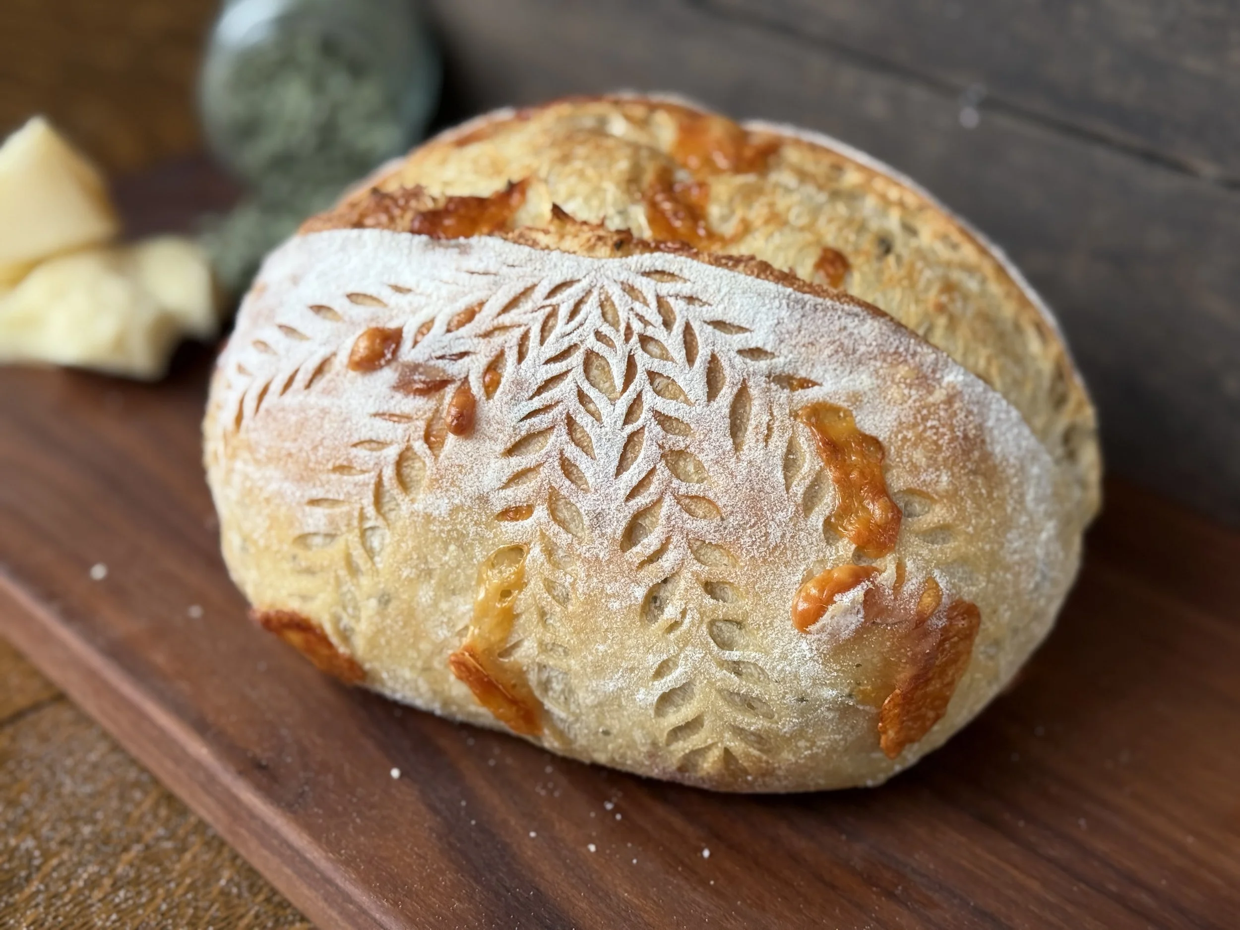 Sourdough bread with chunks of aged Parmesan cheese and oregano from Jeannie’s garden. Made with organic flour